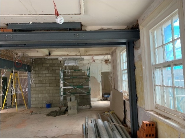 We had to limit steel deflections to safeguard against cracking to first floor walls. Close liaison with a specialist regarding main hall floor repairs was required.
